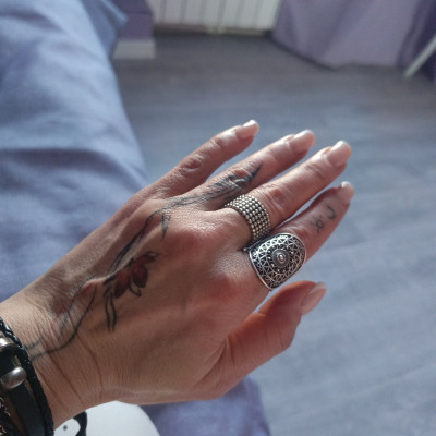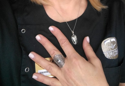 Подбирала кольцо к серьгам, мне кажется, получилось гармонично. Заказала для примерки два размера: свой обычный 16-й и 16,5 (потому что прочитала в отзывах, что кольцо маломерит), остановилась бы на привычном 16-м, он мне подошёл, как обычно. Однако кольцо 16-го размера было гораздо светлее, чем 16,5, поэтому выкупила в итоге более тёмное большое, буду носить на другом пальце.