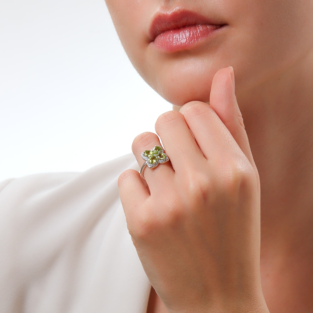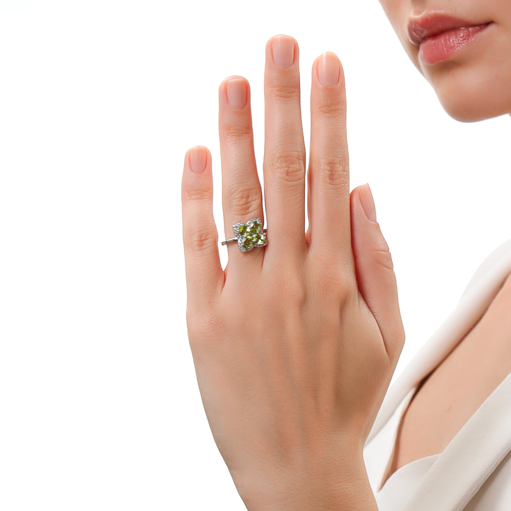 Серебряное кольцо с фианитами и хризолитами природными