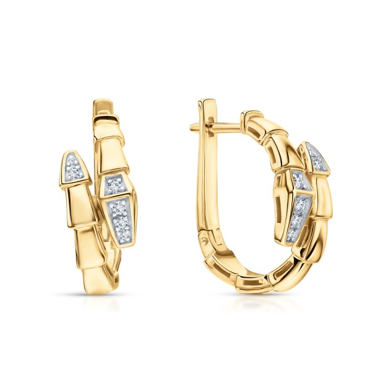 Серьги с 4 бриллиантами природными, 0.07 карат, огранка круг 57 граней, цвет 3, чистота 6, тип огранки А; 4 бриллиантами природными, 0.06 карат, огранка круг 57 граней, цвет 3, чистота 6, тип огранки А; 2 бриллиантами природными, 0.01 карат, огранка круг 57 граней, цвет 3, чистота 6, тип огранки А; 2 бриллиантами природными, 0.008 карат, огранка круг 17 граней, цвет 2, чистота 2, тип огранки А; Желтое золото 585 пробы.